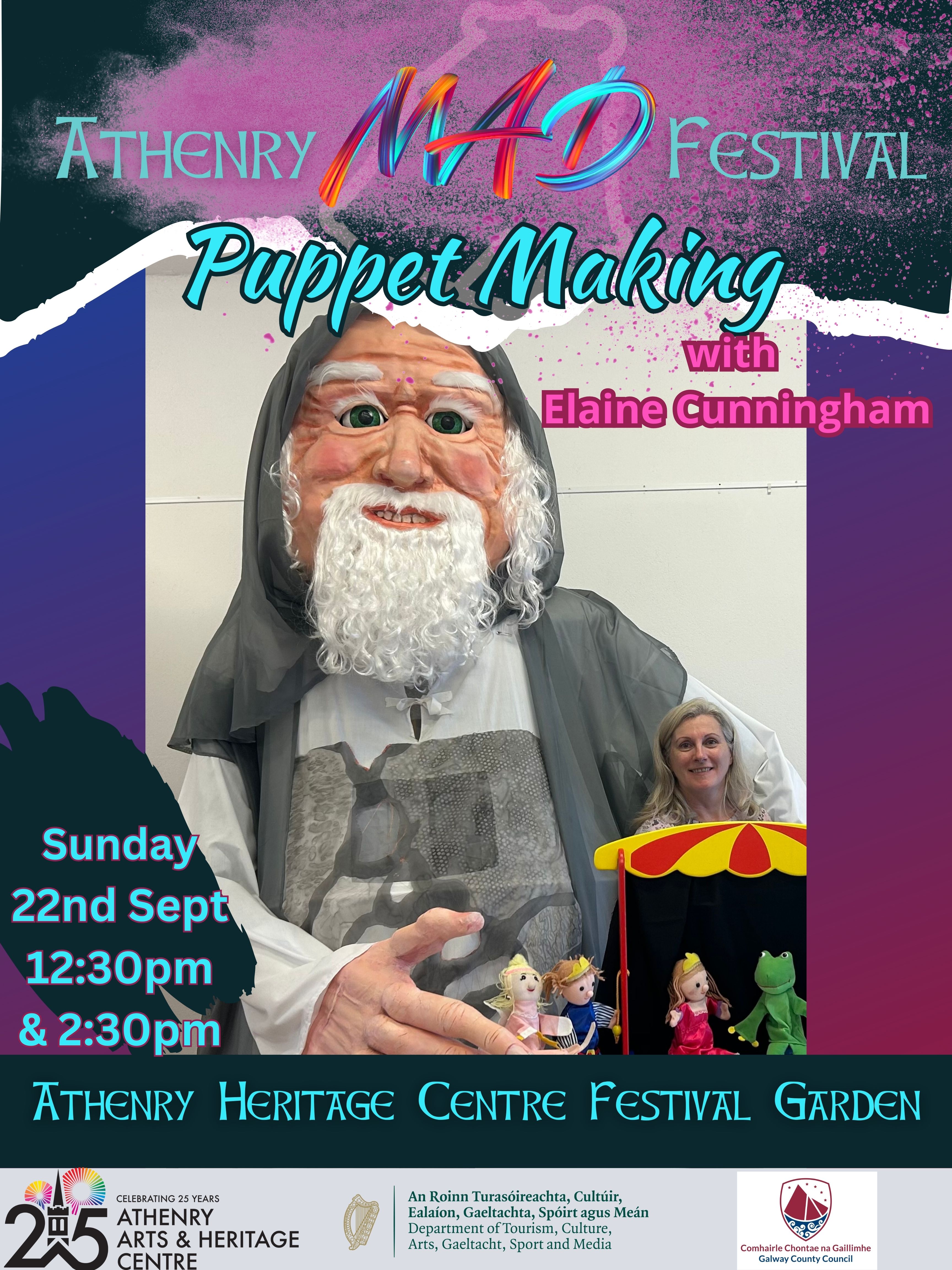 Join Elaine and her crew as they introduce the children to the fabulous art of puppet making in the festival garden of the Athenry Arts & Heritage Centre.
