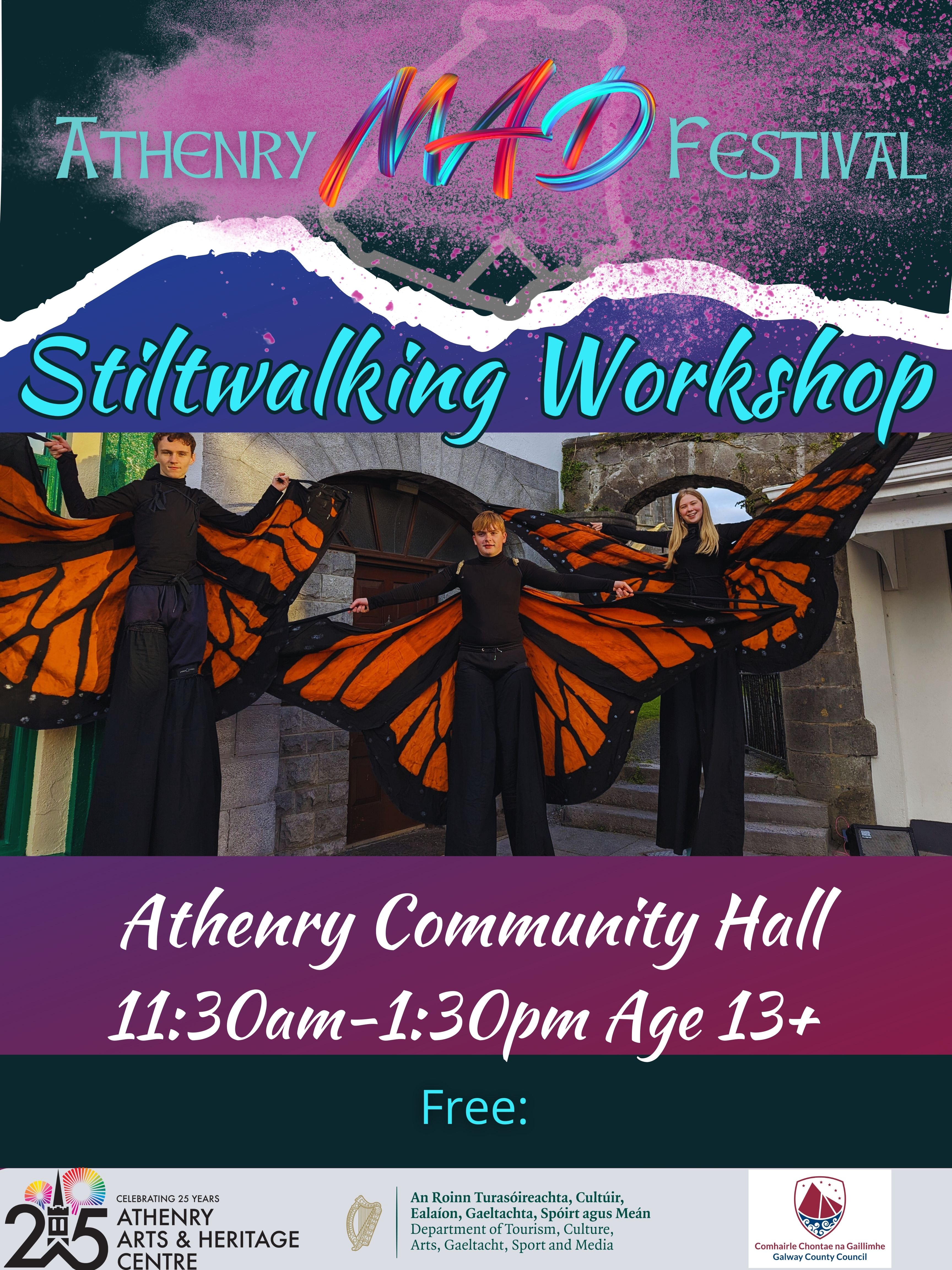 Come join us at the Athenry Community Hall for a free fun-filled 2 hour workshop of learning how to walk on stilts!